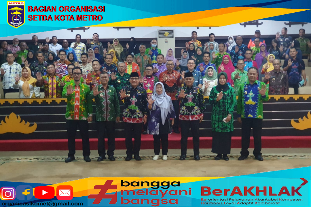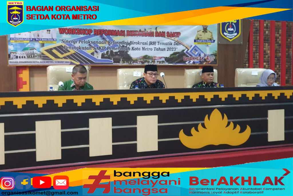 Bagian Organisasi Setda Kota Metro mengadakan Workshop Reformasi Birokrasi dan SAKIP dilingkungan Pemerintah Kota Metro dengan Tema Sinergitas Pelaksanaan Reformasi Birograsi Tematik dan Peningkatan SAKIP Pemerintah Kota Metro pada hari Jum’at tanggal 10 Maret 2023 di Aula Pemda Perintah Kota Metro. Workshop Reformasi Birokrasi ini bertujuan untuk meningkatkan pengetahuan dan pemahaman serta Sinergisitas pelaksanaan Reformasi Birokrasi dan Sistem Akuntabilitas Kinerja Pemerintah Kota Metro yang pada akhir diharapkan dapat mewujudkan good governance dan berdampak pada kesejahteraan masyarakat. Workshop tersebut dibuka oleh Walikota Metro dihadiri oleh Kepala dan Sekretaris Organisasi Perangkat Daerah Se-Kota Metro termasuk Camat dan Para Kepala Bagian Sekeretariat daerah Kota Metro. sebagai leading sektor pelaksana reformasi birokrasi dan tim refomasi birokrasi Pemerintah Kota Metro pungkas Zaki Mubaroq SH.MH selaku Kepala Bagian Organisasi Setda Kota Metro