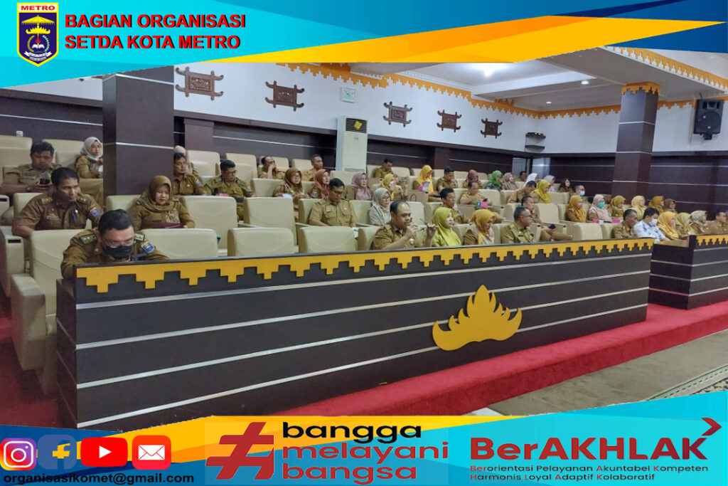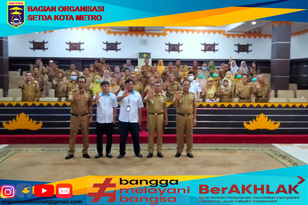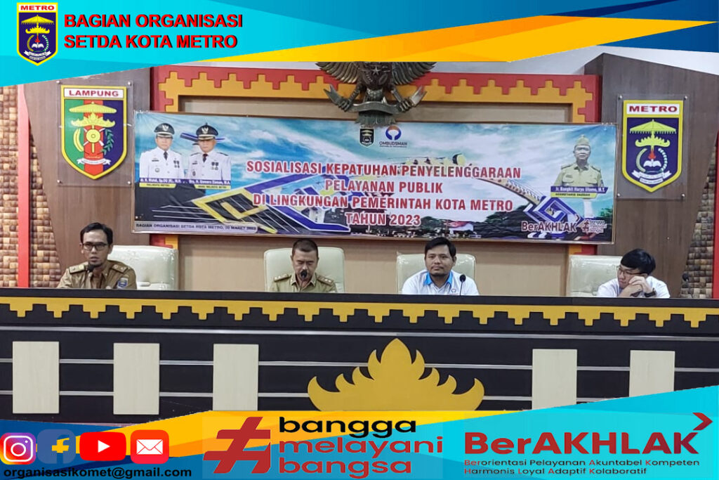 Sebagai upaya peningkatan kualitas penyelenggaraan pelayanan publik serta peningkatan nilai kepatuhan standar pelayanan publik, Pemerintah Kota Metro melalui Bagian Organisasi Setda Kota Metro menyelenggarakan Sosialisasi kepatuhan penyelenggaraan pelayanan publik dan evaluasi hasil penilaian kepatuhan standar pelayanan publik tahun 2022 di Aula Pemerintah Kota Metro, Senin (20/03/2023).